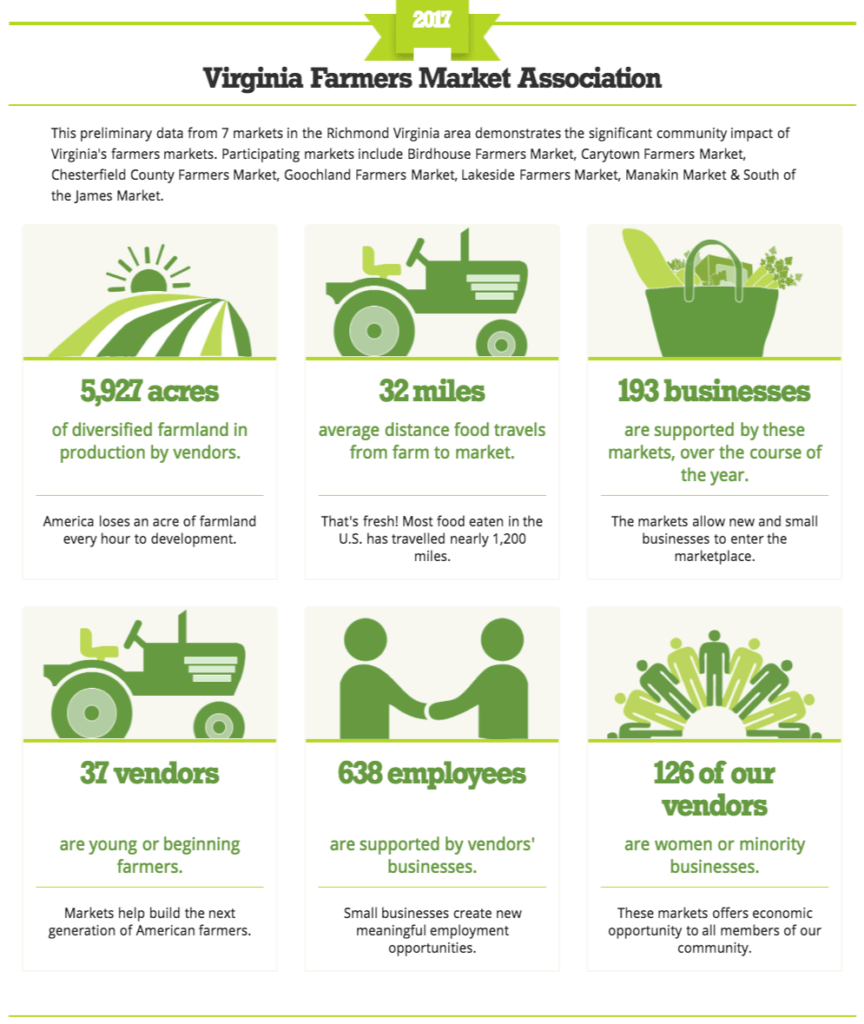 Furthermore, I was able to get in contact with Mary Delicate, who works with the Virginia Farmers Market Association. She was able to provide me with a website that compiled data in 2017 to try to measure the impact of farmers markets in Richmond. A graphic displaying this information can be seen below. Some highlights of this data include the fact that these markets support 193 businesses, and 32 miles is the average distance travelled to arrive at the market, illustrating that the food is fresh.
